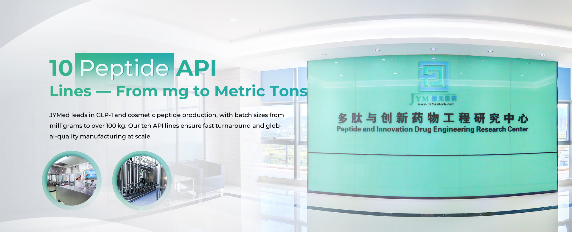 2009 ರಲ್ಲಿ ಸ್ಥಾಪನೆಯಾದ JYMed, ಚೀನಾದಲ್ಲಿ ಪ್ರಮುಖ ಪೆಪ್ಟೈಡ್ CRDMO ಸೇವಾ ಪೂರೈಕೆದಾರ ಮತ್ತು ಜೆನೆರಿಕ್ API ತಯಾರಕರಾಗಿದ್ದು, ಪೆಪ್ಟೈಡ್ ವಸ್ತುಗಳ ಕಸ್ಟಮ್ ಸಂಶ್ಲೇಷಣೆ, ಪ್ರಕ್ರಿಯೆ ಅಭಿವೃದ್ಧಿ, ಕ್ಲಿನಿಕಲ್ ಪೂರೈಕೆ ಮತ್ತು ವಾಣಿಜ್ಯೀಕರಣದಲ್ಲಿ ಪರಿಣತಿ ಹೊಂದಿದೆ. ಕಂಪನಿಯು ಸುಮಾರು 600+ FTE ಗಳನ್ನು ನೇಮಿಸಿಕೊಂಡಿದೆ, ಪೆಪ್ಟೈಡ್ ತಂತ್ರಜ್ಞಾನದಲ್ಲಿ 20 ವರ್ಷಗಳಿಗೂ ಹೆಚ್ಚು ಅನುಭವ ಹೊಂದಿರುವ ತಜ್ಞರನ್ನು ಒಳಗೊಂಡಿರುವ ಕೋರ್ ನಿರ್ವಹಣಾ ತಂಡವನ್ನು ಹೊಂದಿದೆ. JYMed ಒಂದು R&D ಕೇಂದ್ರ ಮತ್ತು ಎರಡು ಪ್ರಮುಖ ಬಹುಪಯೋಗಿ ಉತ್ಪಾದನಾ ಸೌಲಭ್ಯಗಳನ್ನು ನಿರ್ವಹಿಸುತ್ತದೆ, ಬಹು-ಟನ್ ಪ್ರಮಾಣದ ಪೆಪ್ಟೈಡ್ ಉತ್ಪಾದನಾ ಸಾಮರ್ಥ್ಯದೊಂದಿಗೆ.